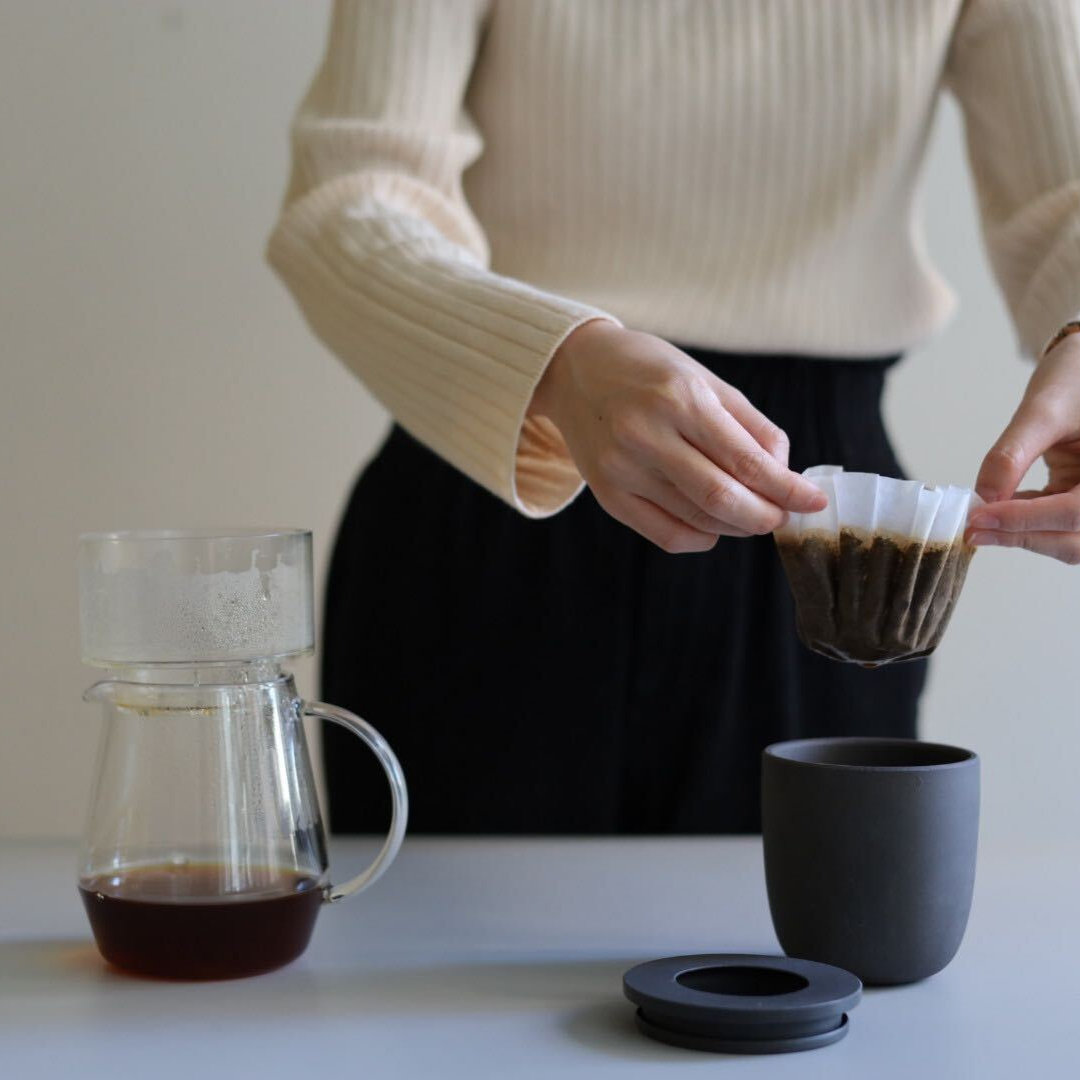 Deodorizing pot that can make utilize used coffee grounds. Simply place the coffee grounds along with the paper filter inside the deodorizer. Because of the vertical structure and lid it will fit most paper filters, including V60 02 and Kalita 185 paper.